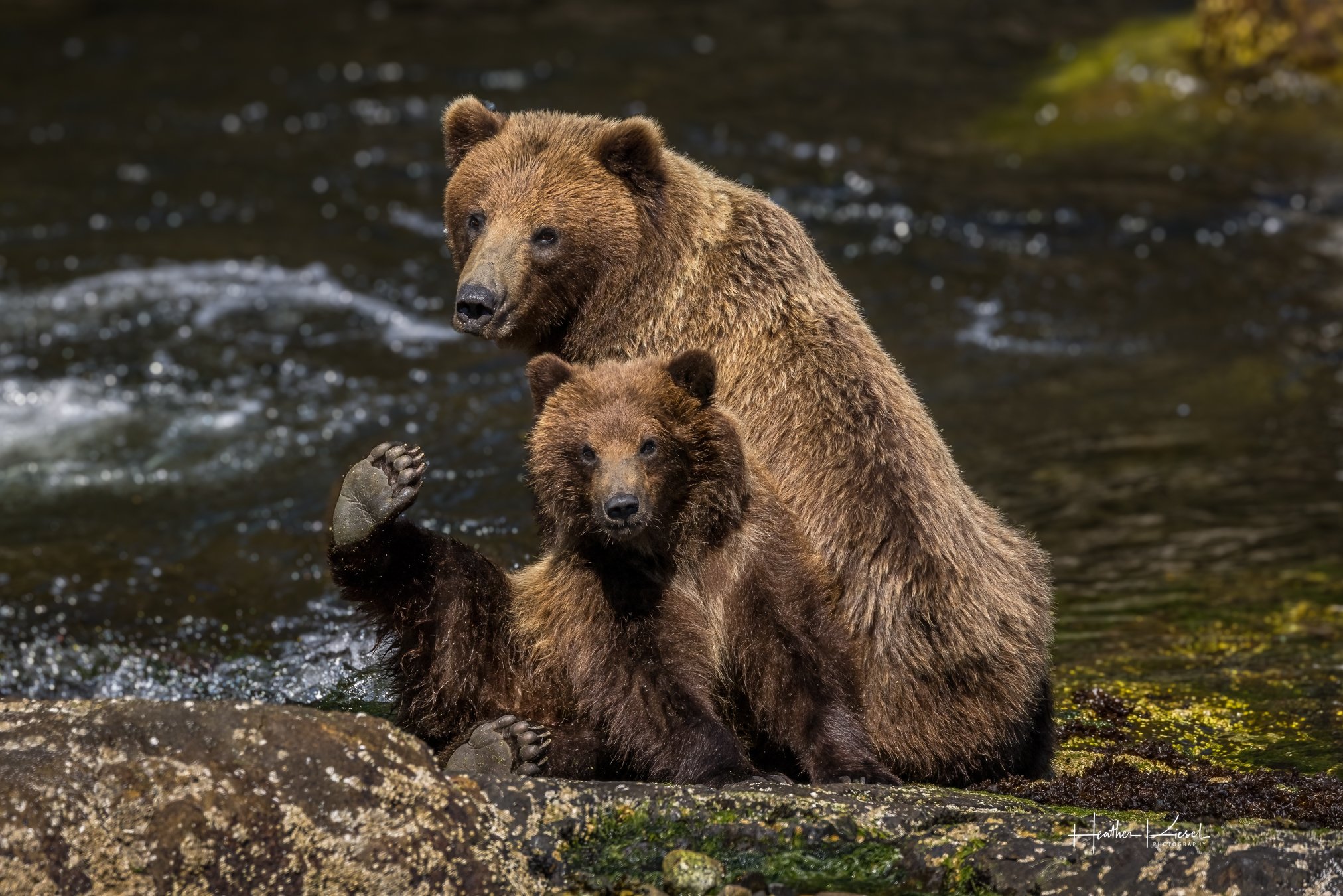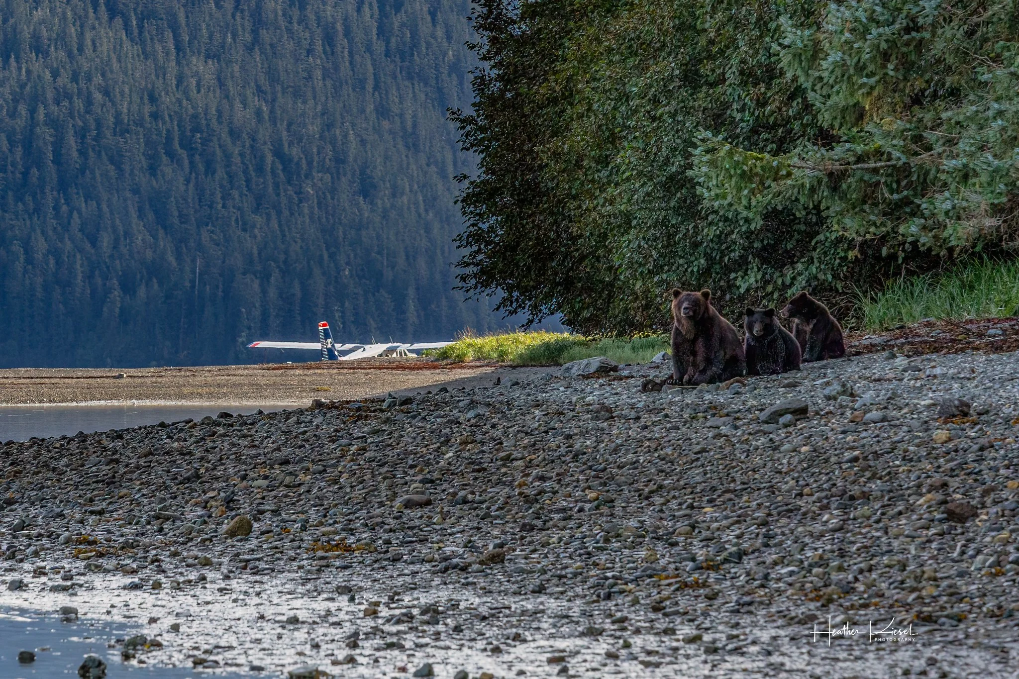 Hiking out along the shoreline to meet the floatplane, the tide was higher than expected. Rounding a corner, we came upon a coastal brown bear mother with two cubs resting quietly ahead — blocking the narrow stretch of beach and leaving no safe way forward.