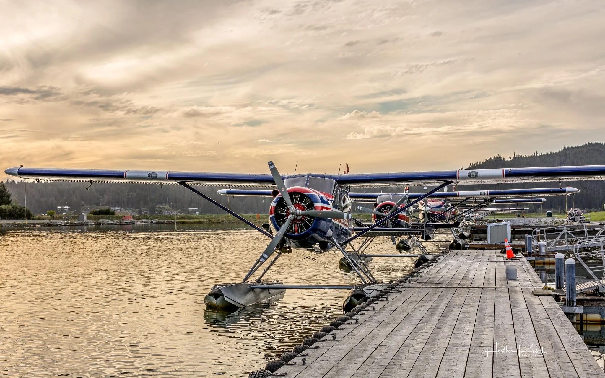 Blue and red Ward Air floatplanes rest at the dock in Juneau, Alaska, ready to depart when weather, tide, and light align.